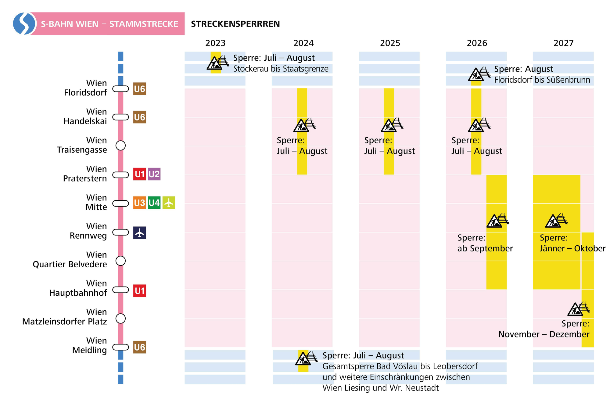 An der Stammstrecke und den nördlichen und südlichen Ausläufern wird bereits seit 2023 gearbeitet. In den letzten zwei Sommern war der Abschnitt zwischen Floridsdorf und Praterstern bereits gesperrt. Auch dieses Jahr wird das im Juli und August der Fall sein, es wird wieder einen Schienenersatzverkehr geben.
