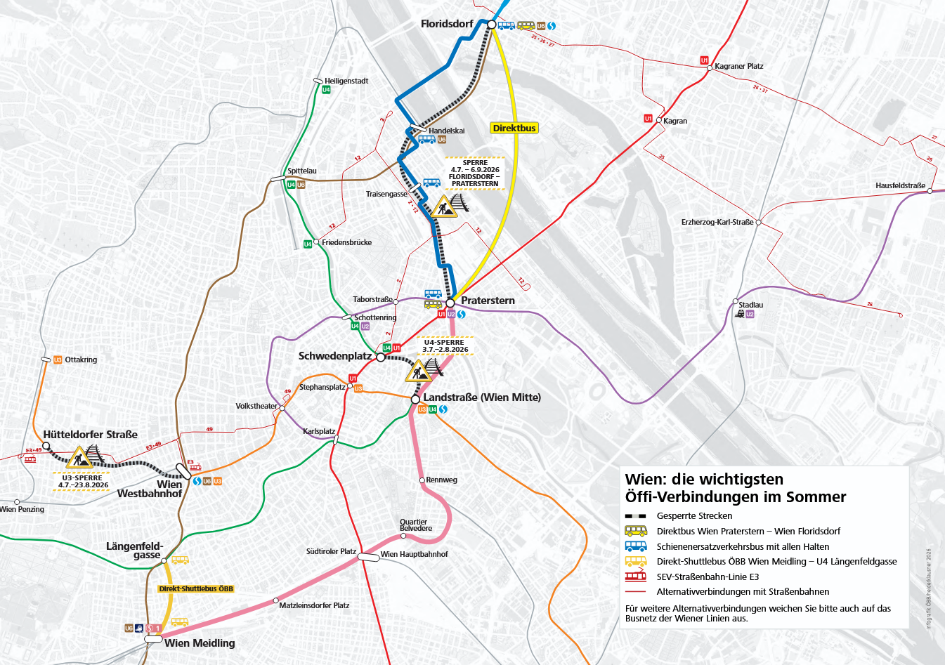 Die ÖBB und die Wiener Linien setzen ihre gemeinsame Modernisierungsoffensive für die Wiener Öffi-Infrastruktur fort. In den kommenden Monaten stehen dabei zwei zentrale Bauphasen auf der Wiener Stammstrecke im Fokus: eine erneute Sommersperre zwischen Wien Praterstern und Wien Floridsdorf von 4. Juli bis 6. September 2026 sowie die 14-monatige Hauptsperre zwischen Wien Hauptbahnhof und Wien Praterstern ab 7. September 2026. Die enge Zusammenarbeit beider Partner hat sich in den bisherigen Bauphasen bewährt und wird auch diesmal für gut abgestimmte Alternativen sowie ein weiterhin starkes Öffi-Angebot in Wien sorgen.