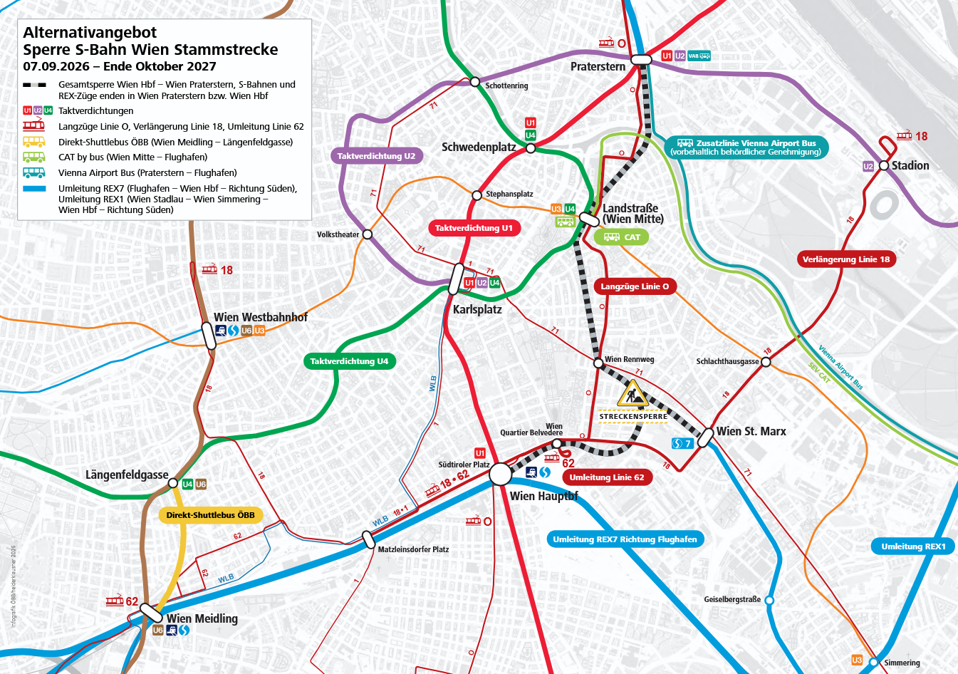 Mit dem Ende der Sommersperre beginnt die größte Bauphase des S-Bahn Wien Upgrades. Von 7. September 2026 bis Ende Oktober 2027 ist der zentrale Abschnitt der Wiener Stammstrecke zwischen Wien Hauptbahnhof und Wien Praterstern für 14 Monate gesperrt. In dieser Zeit erneuern die ÖBB wesentliche Teile der Infrastruktur, wie Viadukte und Einschnittsmauern, um künftig längere, moderne Züge und ein leistungsfähigeres Angebot auf der Stammstrecke zu ermöglichen.